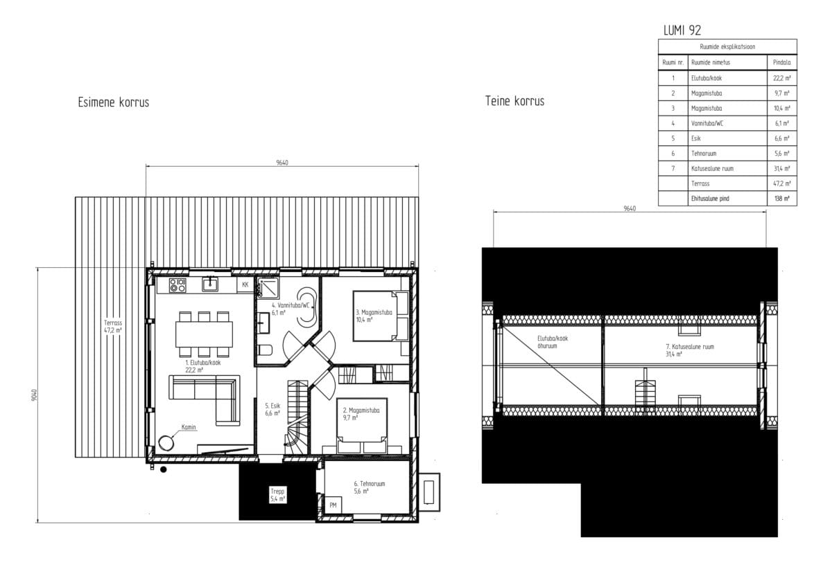 Lumi elutuba-köök on kodu südameks – suurte akende ja kõrguva laega ruum on valgusküllane ja avatud, sobides nii igapäevaeluks kui ka külaliste võõrustamiseks. Kamina lisamine loob hubase ja soojuse keskme, mis kutsub endas viibima iga ilmaga. Otse elutoast pääseb ka 47 m² suurusele terrassile, mis on ideaalne koht suviseks hommikukohviks või pereõhtusöögiks.
